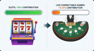 - Live Casino/Table Games: Often contribute only 10%–20%. (Bet $10, and only $1 or $2 counts).